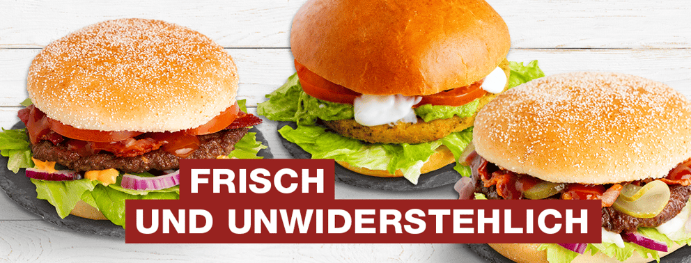 mit saftigem Rindfleisch, original WOP-Burgersauce, knackigem Salat, Gewürzgurken, Tomaten & roten Zwiebeln